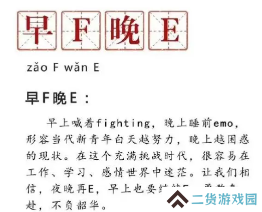 早F晚E,网络流行语,指早上喊fighting,晚上睡前却emo的现象。形容了现代新青年在白天努力奋斗,晚上却常常困惑的状态。