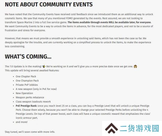 联合声明中提到:“我们看到你们中的许多人提到了活动产生的FOMO(Fear of Missing Out,指一些玩家担心错过限时提供的装饰物品)。请放心,我们并不想将《战锤40K:星际战士2》变成一款完整的实时服务游戏,通过活动获得的物品将在之后提供给所有玩家。”