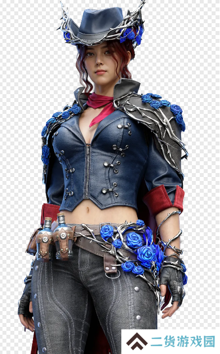 包裹紧致的蓝黑色贴身皮革,在优雅中显出性感。纠缠在藤曼中的蓝玫瑰与点缀的红丝巾相互映衬,打造一身潇洒又利落的造型。