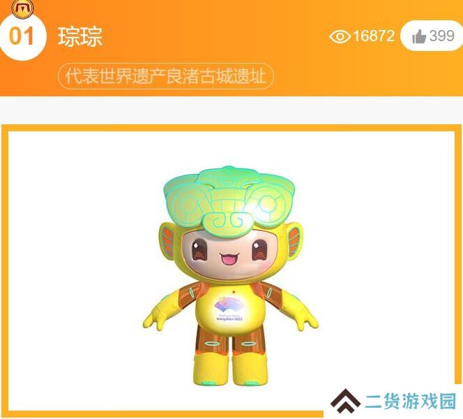 琮琮的名字源于良渚古城遗址出土的代表性文物玉琮。具有精美绝伦纹饰的玉琮是良渚文化的重要标志物,散发着永恒的魅力。全身以源自大地、象征丰收的黄色为主色调,头部装饰的纹样取自良渚文化的标志性符号“饕餮纹",意寓“不畏艰险、超越自我”。