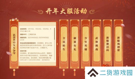 3月13日、3月17日、3月20日、3月25 日、4月9日22:00,新服分阶段开放重要系统功能。阶段开放当天,强力 BOSS 现身武林。帮会合力击退 BOSS,根据伤害排名获得帮会BOSS奖励,世界拍卖还会刷新珍贵宝物,快和帮会兄弟并肩作战!