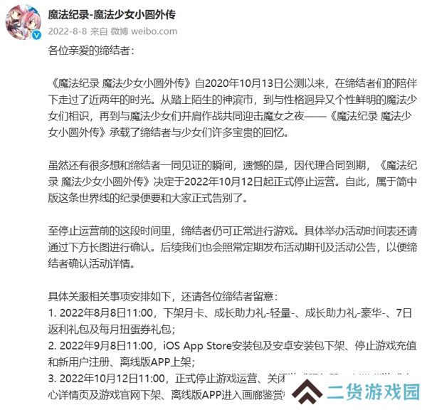 魔法纪录魔法少女小圆外传宣布停运 游戏已运营七年。不久前魔法纪录魔法少女小圆外传宣布了有关于停服的相关消息。官方表示表示将在7月末停止有关游戏服务。