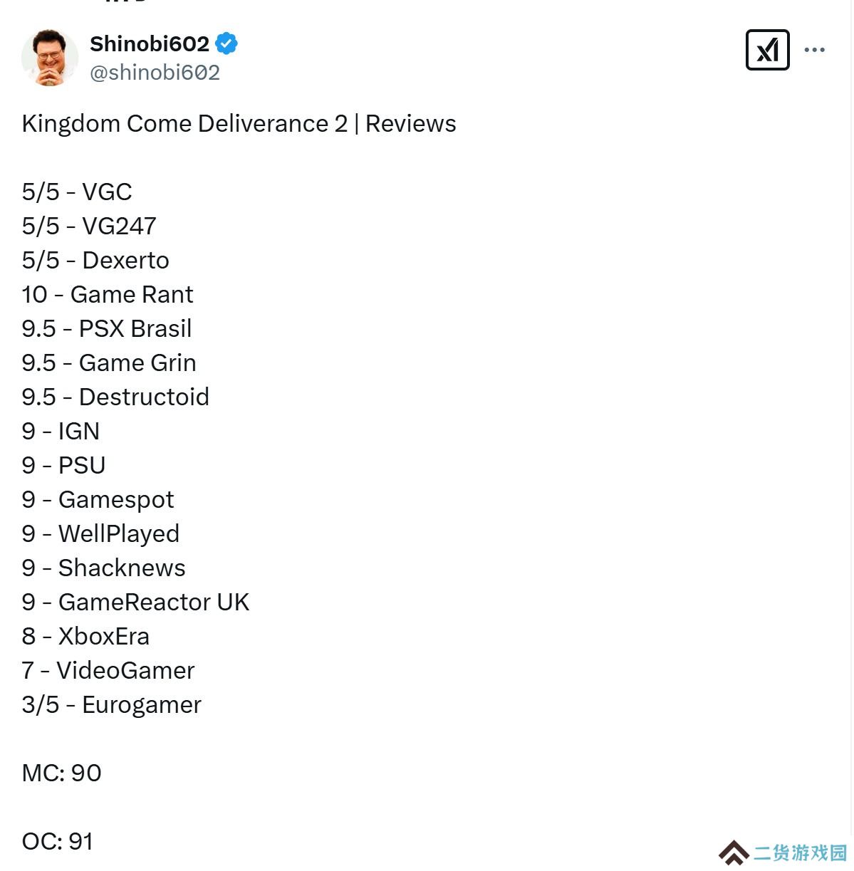 天国拯救2在IGN的评分为9分,MTC均分为87分,获得了高度评价。