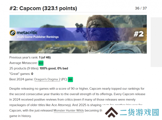 2)卡普空(323.1分) – 82.1 (去年:第1名)?最佳游戏:《龙之信条2》?88分