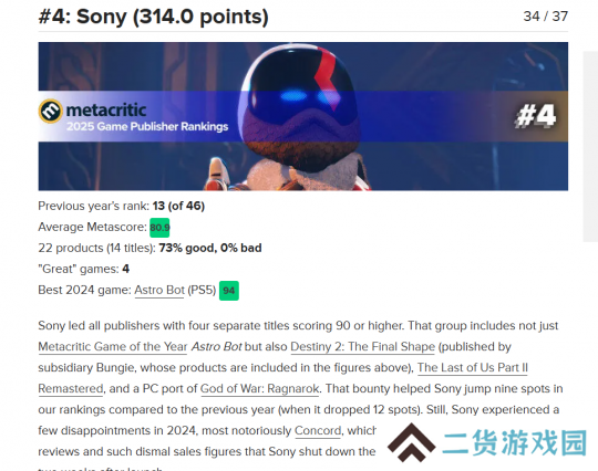 4)索尼?(314分) – 80.9 (去年:第13名)?最佳游戏:《宇宙机器人》?94分