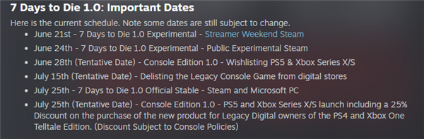 七日杀发布日程公布 7月25日PC/主机版正式发售!经过超过10年的抢先体验,经典僵尸末日生存游戏七日杀终于迎来了正式版。官方最近公布了一系列测试发布日程,其中包括了7月25日PC和主机版的正式发售日期。敬请期待!
