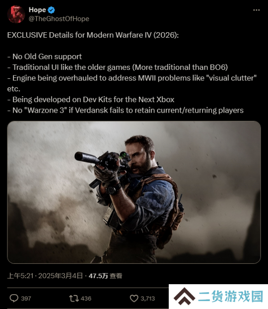 根据此前曾多次泄露正确信息的《使命召唤》泄密者 TheGhostOfHope 在社交媒体上爆料称,《使命召唤》2026 年的新作正在为下世代 Xbox 主机开发。这据称将是目前《现代战争》子系列的新作。
