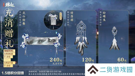 3月6日7:00-3月13日7:00,侠士在全区服消耗通宝购买绑定商品或购买并实装不绑定商品时,可享150%积分限时回馈!