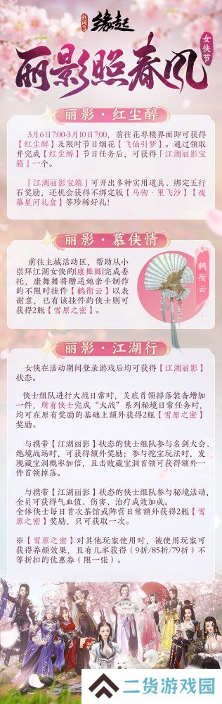 3月6日7:00-3月10日7:00活动期间,前往花萼楼界面可领取「红尘醉」与限时节日烟花「飞仙引梦」,完成「红尘醉」任务后开启「江湖丽影宝箱」即有概率获得不绑定版「马驹·里飞沙」、「夜幕星河礼盒」等惊喜掉落!完成「康舞舞」的委托必得限定挂件「鹤衔云」,已拥有该挂件的侠士则可获得「雪原之密」,对其他玩家使用「雪原之密」可为其附加养颜效果,且目标侠士有几率获得限享一张的(9折/85折/79折)不等折扣优惠券!愿各位侠士若皎月凌霜华,似飞鸿踏无踪,在这片江湖书写专属于你的璀璨篇章!