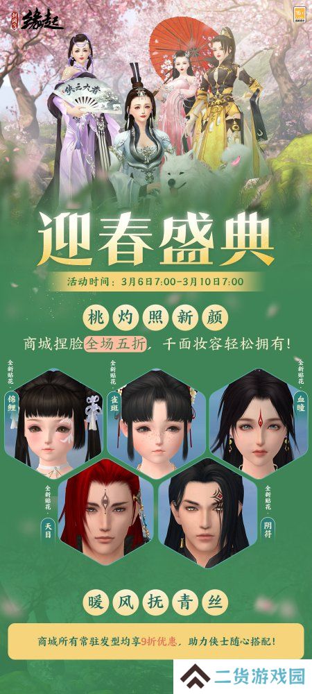 春意渐浓,焕新正当时!3月6日7:00—3月10日7:00,《剑网3缘起》开启春日限时钜惠!捏脸系统全场5折,商城常驻发型同步开启9折优惠,更有多款精致贴花即日起长期上架商城,助侠士轻松打造专属春日妆容,共赴这场美丽邂逅!