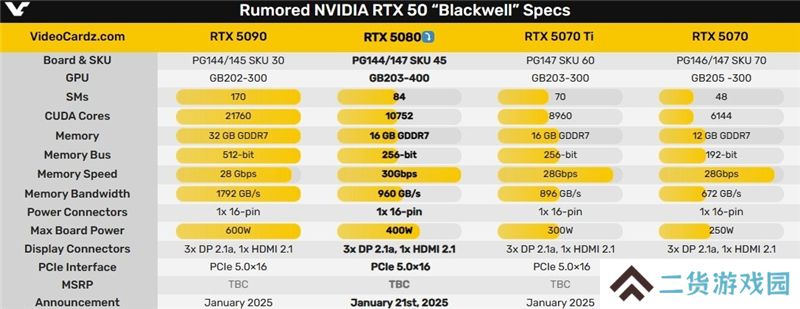 但显存规格升级到了GDDR7技术,显存速度预计可达30-32 Gbps。此外,RTX 5080还配备了256位宽的显存接口。